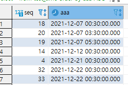 시간 순서로 정렬하게 되면 오름차순 : 예전 시간 순서대로 (년, 월, 일, 시간 상관없이!) 내림차순 : 최근 시간 순서대로 select * from test_time order by aaa ASC ; 테스트용 코드 drop table test_time; create table test_time( seq bigint(20) not null comment '순서', aaa datetime comment '날짜정렬', primary key(seq) ) insert int test_time values(1, '2021-12-22 00:30:00.000'); insert into test_time (aaa) (select aaa from test_time); //데이터 복사 후 테스트 하기 위해 수정했음 --..